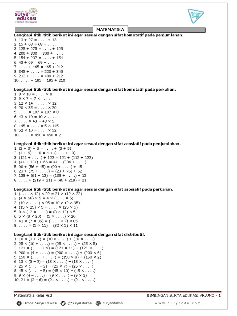 Soal Matematika 4 Sd Komutatif Asosiatif Dan Distributif Beserta