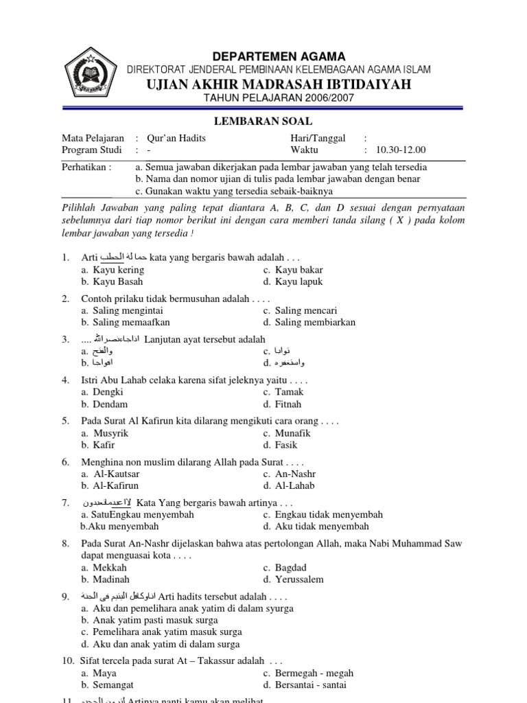 Soal Ukk Kelas 11 Mapel Al Qur An Hadits Warta Madrasah