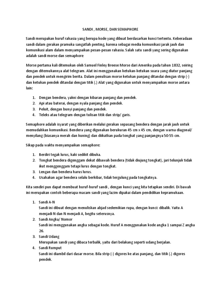 Berbagi ke twitter berbagi ke facebook bagikan ke pinterest. Jadi teman teman pembaca website penulis cilik sandi morse ini mulai berkembang pada abad ke 19 dimana kala itu teknologi radio dan telegram juga berkembang. Anda dapat menjadikan contoh latihan soal kepramukaan dan kunci jawabannya bagian 2 sebagai bahan untuk pembuatan soal pramuka pada saat kegiatan perkemahan atau pun lomba cerdas cermat pramuka.