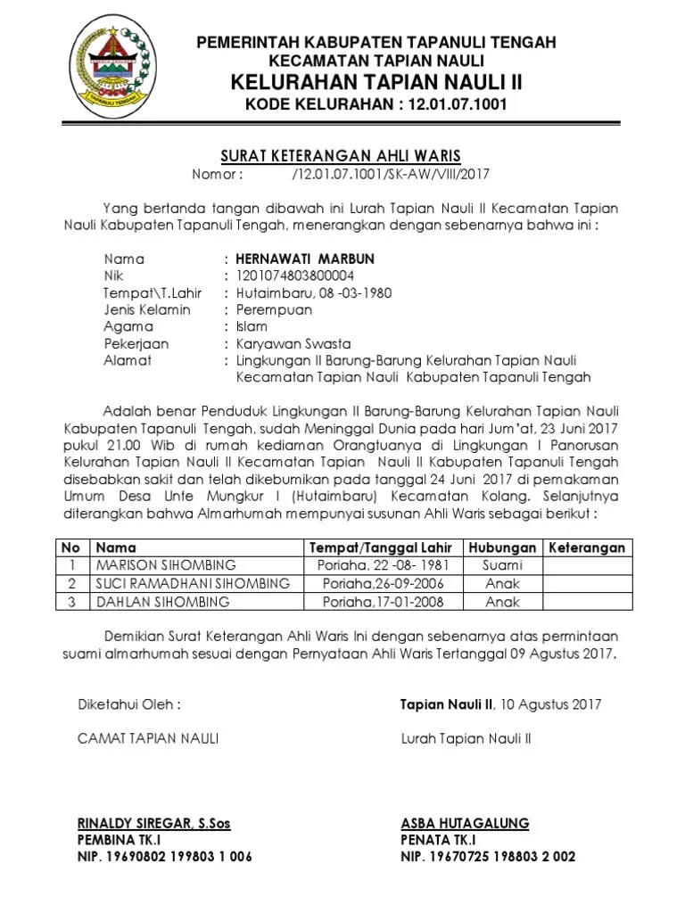 Dilansir dari hukumonline.com, surat keterangan ahli waris untuk warga negara indonesia (wni) asli, dibuat nantinya proses akan dilanjutkan ke tingkat kelurahan dan kecamatan. Surat kerterangan usaha adalah dokumen yang ditandangani dan di stempel lurah / kepala desa serta camat setempat yang berisikan keterangan dari pihak kelurahan dan kecamatan (tergantung daerah) bahwa pemohon benar menjalankan usaha sesuai yang tertera pada surat keterangan. Ahli waris biasanya lebih dari satu orang, dan ini merupakan ahli waris yang sah secara hukum. 6000 apabila pengambilan kepada ahli waris surat keterangan ahli waris diketahui lurah kepala desa berikut adalah contoh surat keterangan ahli waris saat mengurus pembatalan haji dan. Mempunyai dokumen surat keterangan dan pernyataan ahli waris memiliki peranan yang sangat penting, karena keberadaannya dapat membuat seseorang surat kematian pewaris/orang tua dari kelurahan.